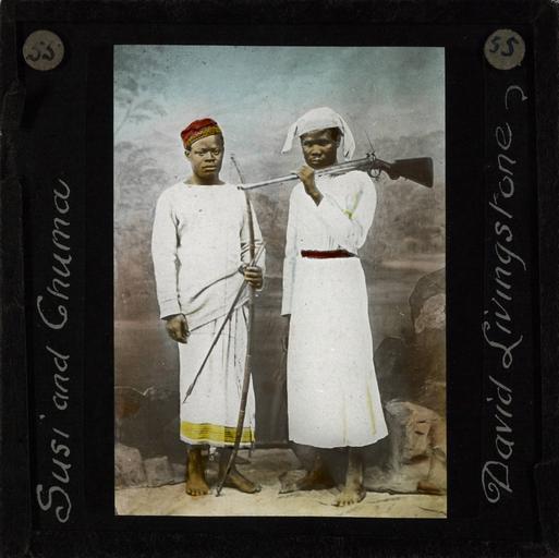 Keywords: Susi and Chuma, Africa, ca.1870-ca.1900 (imp-cswc-GB-237-CSWC47-LS16-055).jpg en <br> Susi and Chuma Africa ca 1870-ca 1900 Photograph of two loyal servants of David Livingstone Susi and Chuma both freed from slavery by Livingstone One man is pictured carrying a bow and arrow the other a rifle Following the death of Livingstone Susi and Chuma carried his body all the way to Bagamoyo on the coast of modern day Tanzania From there it was handed over to the British authorities and transported to London for burial ; This belongs to a series of Church of Scotland Foreign Missions Committee lantern slides relating to David Livingstone 1813-1873 the Scottish missionary who was best known as an explorer of Africa and anti-slavery campaigner Livingstone was born in Blantyre Scotland and after working in the local cotton mill from the age of 10 he went on to study medicine and theology in Glasgow in 1836 Having decided to become a missionary he was posted to southern Africa in 1841 In 1845 he married Mary Moffat During his life Livingstone carried out exploration of southern eastern and central Africa he discovered and named the Victoria Falls and it was his meeting with H M Stanley during a search for the source of the Nile that gave rise to the popular quotation Dr Livingstone I presume David Livingstone died in Africa on 1 May 1873 and his body was buried in Westminster Abbey Photographer Unknown Subject personal name Livingstone David 1813-1873 Filename imp-cswc-GB-237-CSWC47-LS16-055 tif Coverage date after 1873 Part of collection International Mission Photography Archive ca 1860-ca 1960 Type images Part of subcollection Photographs from the Centre for the Study of World Christianity University of Edinburgh U K ca 1900-ca 1940s Repository name Centre for the Study of World Christianity Archival file impaunpub_Volume7/1888 url Repository address The University of Edinburgh School of Divinity New College Mound Place Edinburgh EH1 2LX United Kingdom Geographic subject country Zambia Format aacr2 1 lantern slide 8 x 8 cm Geographic subject continent Africa Rights Contact the repository for details Part of series David Livingstone LS16 Repository email divinity-CSWC ed ac uk Subject lcsh Keyword Explorers; Missionaries Date created circa 1875/1940 Publisher of the digital version University of Southern California Libraries Subject aat genre interior views Format aat lantern slides Legacy record ID impa-m69471 Access conditions http //www ed ac uk/schools-departments/divinity/research/centres/world-christianity/collections-resources File GB 237 CSWC47/LS16/55 circa 1875 /1940 author http //digitallibrary usc edu/cdm/ref/collection/p15799coll123/id/65004 PD-old-70-1923 Magic lantern images Images from USC Digital Library uploaded by Fæ International Mission Photography Archive ca 1860-ca 1960 David Livingstone IMPA |