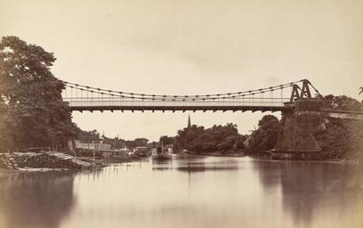 Keywords: Suspension bridge at Dacca, erected in 1830.jpg en Photograph of Dacca Dhaka taken in the 1880s from an album 'Architectural Views of Dacca' containing 13 prints by Johnston and Hoffman Dhaka now the capital of Bangladesh became prominent in the 17th century as a provincial capital of the Mughal empire and was a major centre of trade particularly in fine muslins Its history though largely obscured is ancient and it was brought under Islamic rule by the 13th century first by the Delhi Sultanate then by the independent sultans of Bengal after which it was taken by the Mughals in 1608 In the 18th century Dhaka was eclipsed by Murshidabad under the Nawabs of Bengal and its population diminished As the fortunes of the Nawabs declined the power of the East India Company became a new factor Queen Victoria ™s Proclamation in 1858 brought all the territories held by the Company including Dhaka under British rule This view looking along the Buriganga river towards a suspension bridge with a church tower beyond 1880 http //www bl uk/onlinegallery/onlineex/apac/photocoll/s/019pho000001019u00004000 html Johnston and Hoffmann Custom license marker 2013 01 04 PD-Bangladesh Uploaded with UploadWizard Johnston and Hoffmann Old vintage photographs of Bangladesh Suspension bridges in Bangladesh |