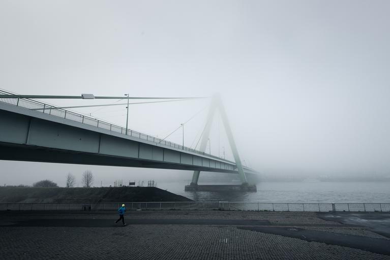 Keywords: suspension bridge modern crossing river architecture fog mist weather riverside embankment structure road transportation construction engineering infrastructure