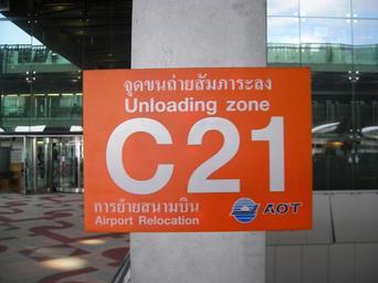 Keywords: Suvarnabhumi Airport - Sign "Unloading zone C 21 - Airport Relocation" - AOT.JPG Suvarnabhumi Airport - Sign Unloading zone C 21 - Airport Relocation - AOT The relocation from Don Mueang Airport had to be accomplished in just one day so smooth organisation by the operator Airports of Thailand PCL was crucial Employees forgot to remove the sign the relocation had been acclomplished in 28 September 2006 this image was captured 28 February 2007 own 2007-02-28 User Mattes Exterior of Suvarnabhumi International Airport Bilingual signs in Thailand Moving and relocation Suvarnabhumi International Airport Loading freight 21 number Orange and white Taken with Nikon Coolpix L2 Work by Mattes 2007 Orange signs User Mattes/Contributions/Topics/Transport User Mattes/Contributions/Topics/Thailand User Mattes/Contributions/Topics/banners coat of arms flags logos seals and signs Rectangular signs |