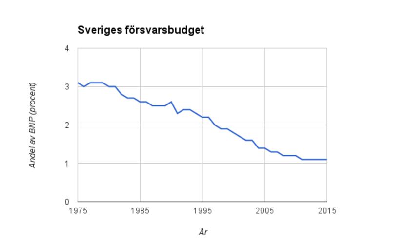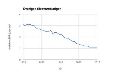 Keywords: Sveriges försvarsbudget.png sv Sveriges försvarsbudget som andel av bruttonationalprodukten en Sweden's military budget as a percentage of gross domestic product 2016-10-28 own Data source http //www forsvarsmakten se/sv/om-myndigheten/ekonomisk-planering-och-redovisning/forsvarets-andel-av-bnp/ <pre> 1975 3 1 1976 3 1977 3 1 1978 3 1 1979 3 1 1980 3 1981 3 1982 2 8 1983 2 7 1984 2 7 1985 2 6 1986 2 6 1987 2 5 1988 2 5 1989 2 5 1990 2 6 1991 2 3 1992 2 4 1993 2 4 1994 2 3 1995 2 2 1996 2 2 1997 2 1998 1 9 1999 1 9 2000 1 8 2001 1 7 2002 1 6 2003 1 6 2004 1 4 2005 1 4 2006 1 3 2007 1 3 2008 1 2 2009 1 2 2010 1 2 2011 1 1 2012 1 1 2013 1 1 2014 1 1 2015 1 1 </pre> Gabbe other versions cc-zero Military of Sweden Government budget of Sweden Economic line charts |