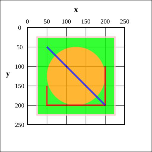 | Keywords: SVG example markup grid.svg en SVG example markup displayed on a grid The image demonstrates the below example markup <source lang xml > <rect x 25 y 25 width 200 height 200 fill lime stroke-width 4 stroke pink /> <circle cx 125 cy 125 r 75 fill orange /> <polyline points 50 150 50 200 200 200 200 100 stroke red stroke-width 4 fill none /> <line x1 50 y1 50 x2 200 y2 200 stroke blue stroke-width 4 /> </source> 2015-05-25 Own Offnfopt other versions other fields O v Custom license marker 2015 05 25 Offnfopt cc-zero Examples representing SVG |