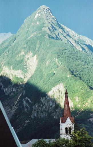 Keywords: SvinjakBovec-1.jpg en Svinjak mountain in the Julian Alps above town Bovec Slovenia Own Sl-Ziga 1989 Svinjak Bovec Saint Ulrich of Augsburg churches in Slovenia Bovec Church towers in Slovenia