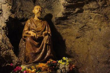 Keywords: Svorad jeskyn 1.JPG en Ruin of abbey Velká Skalka statue of St Svorad Andreas Skalka u Trenčína Slovakia cs Zříceniny opatství Skalka u Trenčína socha sv Svorada Ondřeje own Kenad 2010-07-16 Benedictine abbeys in Slovakia Skalka nad Váhom
