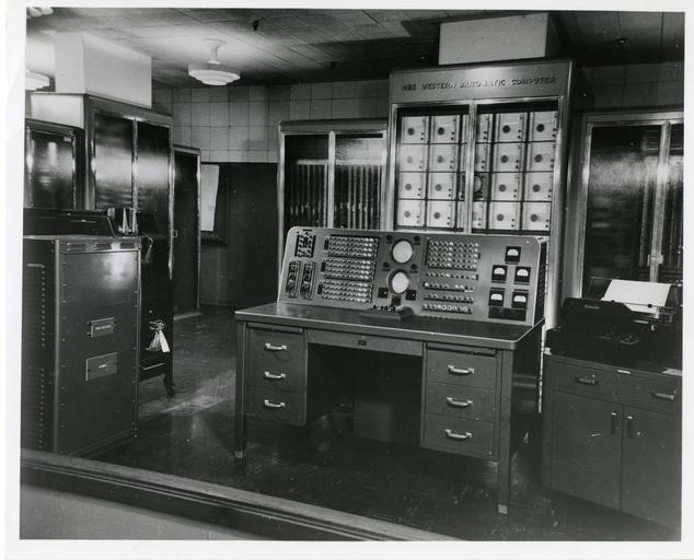 | Keywords: SWAC 009.jpg Directly behind the operating console center foreground was the Williams memory consisting of a bank of 37 cathode-ray tubes On either side of the Williams memory was cabinets containing the control unit Other cabinets in the left background contained the magnetic drum auxiliary memory and its control circuitry In front of the magnetic drum was the punched-card input-output system and on the right of the console was a paper-tape input unit National Institute of Standards and Technology National Institute of Standards and Technology PD-USGov-NIST PD-USGov SWAC computer |