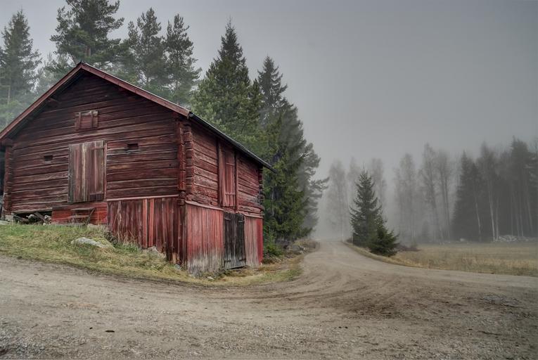 Keywords: sweden red barn landscape country nature rural summer falun mist