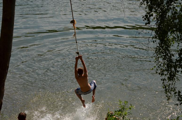 Keywords: swim romp paddling lake summer wet rope swing fun boy commute jump
