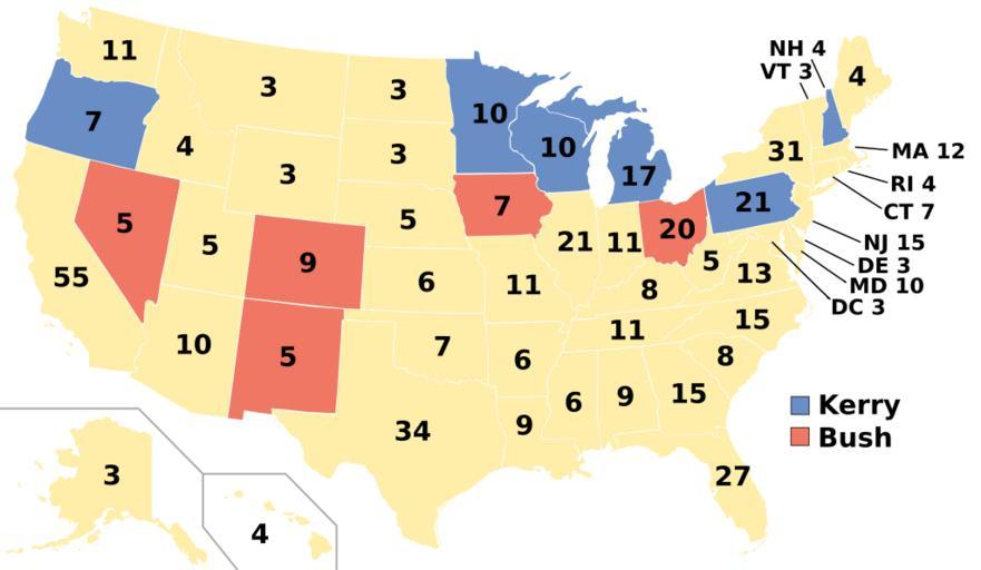 Keywords: Swing states, 2004.svg States in the 2004 United States Presidential election where the margin of victory was 6 or less Blue states went for Kerry red for Bush White states were won by either candidate by 6 or more 2008-07-08 own assumed SteveSims~commonswiki This image is based off this image from Wikipedia which in turn is based off this image from the Commons derivative works 2008 Swing States svg 2004 U S presidential election maps state subdivisions |