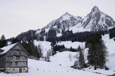 Keywords: switzerland home mountains snow trees landscape winter wintry snowy white mysticism fir trees conifer nature hut