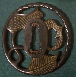 | Keywords: Sword guard (tsuba) with hollyhock leaves and stems signed Masasada.JPG Sword guard tsuba with hollyhock leaves and stems signed Masasada early-19th century Japan shakudō and gold own photo2013 Haa900 Tsuba made with shakudō Alcea rosea in art Cc-zero |