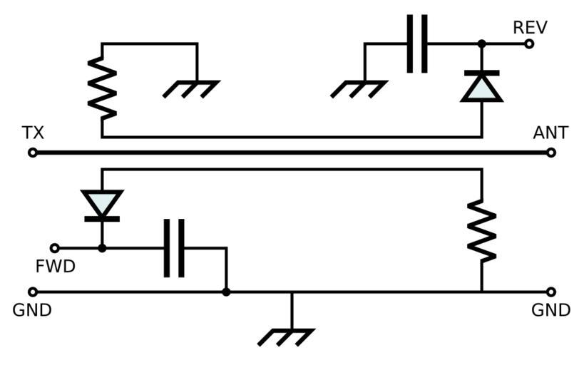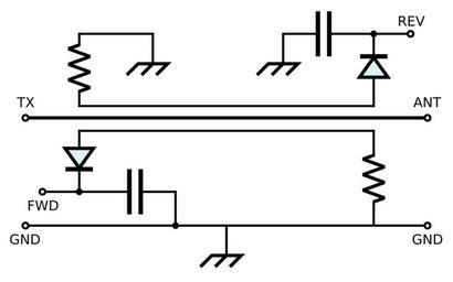 Keywords: SWR Meter.svg SWR meter <br> TX is the input from the transmitter ANT is the antenna connection FWD is the forward wave connection REV is the reflected wave connection GND is the external ground connection own Inductiveload 2009-01-25 SWR meters |