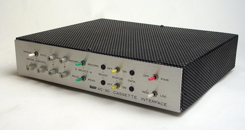 | Keywords: SWTPC AC30 Cassette Interface Front.jpg en The Southwest Technical Products Corporation SWTPC AC-30 tape interface for early personal computers was introduced in May 1976 for 80 When the first home computers were introduced in 1975 floppy disk systems cost 2000 Storing data on audio cassettes was the low-cost but slow option that most hobbyists used SWTPC designed their AC-30 Cassette Interface to meet the proposed Kansas City Standard data format The binary data was recorded using 1200 Hz and 2400 Hz at a 300 baud data rate At 30 bytes per second it took over 4 minutes to load an 8K file <br> Photo taken with a Nikon E3200 camera using tungsten lighting by Michael Holley in March 2005 Own Swtpc6800 Michael Holley 2005-03-05 <gallery> File SWTPC6800 open jpg SWTPC 6800 Computer File SWTPC AC30 Cassette Interface jpg SWTPC AC30 Cassette Interface File SWTPC AC30 Cassette Interface Open jpg SWTPC AC30 Cassette Interface </gallery> Southwest Technical Products Corp Photographs by User Swtpc6800 |
