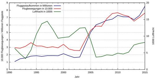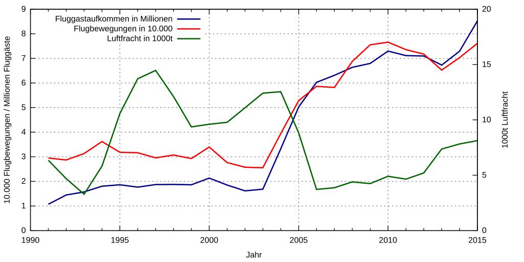 Keywords: SXF stats.svg en Berlin Schönefeld Airport statistical data de Flughafen Berlin-Schönefeld Verkehrszahlen seit 1991 own ; data from http //www berlin-airport de/DE/UeberUns/Verkehrsstatistik/Monatlich/SXF berlin-airport de Gorgo 2011-02-13 Gnuplot script to generate this plot gnuplot <source lang gnuplot > /usr/bin/gnuplot gnuplot 4 2 / Ubuntu 8 10 input set timefmt Y set datafile separator ; output set key top left set style data lines set grid set xdata time set xlabel 'Jahr' set xrange '1990' '2015' set xtics 157680000 set mxtics 5 set format x ' Y' set ylabel '10 000 Flugbewegungen / Millionen Fluggäste' set ytics nomirror set ytics 1 set yrange 0 9 set y2tics 5 set autoscale y2 set y2range 0 20 set y2label '1000t Luftfracht' set term svg size 800 400 font Arial 10 set output 'SXF_stats svg' plot '-' using 1 2/1000000 title 'Fluggastaufkommen in Millionen' axes x1y1 lt rgb 'dark-blue' lw 2 \ '-' using 1 2/10000 title 'Flugbewegungen in 10 000' axes x1y1 lt rgb 'red' lw 2 \ '-' using 1 2/1000 title 'Luftfracht in 1000t' axes x1y2 lt rgb 'dark-green' lw 2 1991;1069886 1992;1446933 1993;1572361 1994;1804490 1995;1861674 1996;1766452 1997;1870213 1998;1876209 1999;1861385 2000;2133919 2001;1851377 2002;1615171 2003;1684384 2004;3325348 2005;5026115 2006;6026228 2007;6313343 2008;6638162 2009;6797158 2010;7297911 2011;7113989 2012;7097274 2013;6727306 2014;7292517 2015;8526268 e 1991;29472 1992;28723 1993;31334 1994;36185 1995;31827 1996;31649 1997;29563 1998;30711 1999;29304 2000;33947 2001;27635 2002;25755 2003;25549 2004;39420 2005;52852 2006;58647 2007;58198 2008;68771 2009;75538 2010;76595 2011;73577 2012;71758 2013;65268 2014;70325 2015;76153 e 1991;6349 1992;4686 1993;3284 1994;5823 1995;10573 1996;13716 1997;14473 1998;12111 1999;9372 2000;9604 2001;9785 2002;11099 2003;12418 2004;12546 2005;8833 2006;3720 2007;3870 2008;4399 2009;4246 2010;4907 2011;4649 2012;5206 2013;7370 2014;7827 2015;8128 e </source> Cc-zero Berlin Schönefeld Airport Images with Gnuplot source code Airport statistics |