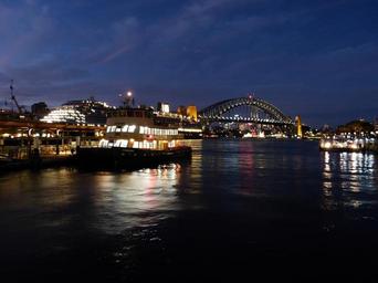 Keywords: sydney port boats bridge harbour bridge night dark tourist cruise cruise ship travel darkness lighting evening ferry
