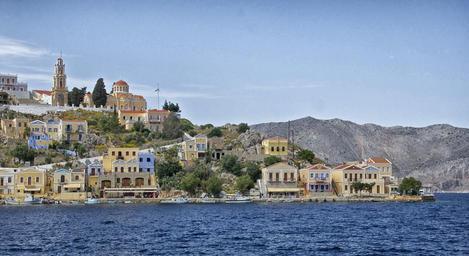 Keywords: symi greece landscape bay harbor water shoreline scenic buildings city town architecture trees nature outside island