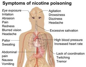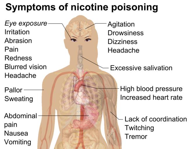 Keywords: Symptoms of nicotine poisoning.png nicotine poisoning Entries The most frequent adverse effects to e-cigarettes and e-liquid reported to US poison control centers Ingestion exposure resulted in vomiting nausea drowsy tachycardia or agitation <ref name Chatham-StephensLaw2016> cite journal Chatham-Stephens Kevin Law Royal Taylor Ethel Kieszak Stephanie Melstrom Paul Bunnell Rebecca Wang Baoguang Day Hannah Apelberg Benjamin Cantrell Lee Foster Howell Schier Joshua G Exposure Calls to U S Poison Centers Involving Electronic Cigarettes and Conventional Cigarettes ”September 2010 “December 2014 Journal of Medical Toxicology June 2016 1556-9039 10 1007/s13181-016-0563-7 27352081 </ref> Inhalation/nasal exposure resulted in nausea vomiting dizziness agitation or headache <ref name Chatham-StephensLaw2016/> Ocular exposure resulted in eye irritation or pain red eye or conjunctivitis blurred vision headache or corneal abrasion <ref name Chatham-StephensLaw2016/> Multiple routes of exposure resulted in eye irritation or pain vomiting red eye or conjunctivitis nausea or cough <ref name Chatham-StephensLaw2016/> Dermal exposure resulted in nausea dizziness vomiting headache or tachycardia <ref name Chatham-StephensLaw2016/> Most e-cigarette calls were a minor effect <ref name Chatham-StephensLaw2016/> Severe outcomes were more than 2 5 times more frequent in children exposed to e-cigarettes and nicotine e-liquid than with traditional cigarettes <ref name KambojSpiller2016> cite journal Kamboj A Spiller H A Casavant M J Chounthirath T Smith G A Pediatric Exposure to E-Cigarettes Nicotine and Tobacco Products in the United States PEDIATRICS 137 6 2016 e20160041 “e20160041 0031-4005 10 1542/peds 2016-0041 27244861 </ref> The initial symptoms are mainly due to stimulatory effects and include nausea and vomiting excessive salivation abdominal pain pallor sweating hypertension tachycardia ataxia tremor headache dizziness muscle fasciculations and seizures <ref name Schep2009> cite journal Schep Leo J Slaughter Robin J Beasley D Michael G Nicotinic plant poisoning Clinical Toxicology Philadelphia Pa 47 8 September “October 2009 771 “781 1556-3650 10 1080/15563650903252186 19778187 </ref> References reflist own Mikael Häggström 2016-08-07 Symptoms of nicotine poisoning svg Cc-zero Intoxication |