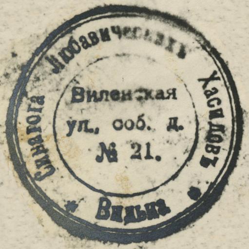 Keywords: circle round text Synagogue of Lubavitcher Hasidim. Vilna. Vilna Street, private house number 21. The Lubavitcher Hasidim are adherents of a Hasidic movement known as Chabad (also known as Lubavitch and Chabad-Lubavitch). The word “Chabad” is a Hebrew acronym for “Chochmah, Binah, Da’at” which translates to “Wisdom, Understanding, Knowledge.” This movement was founded in Liozna in 1775 (this town was in the Grand Duchy of Lithuania at the time, and is now in Belarus) by the Orthodox Rabbi Schneur Zalman. Today it is headquartered in the Crown Heights neighborhood of Brooklyn, New York. This book stamp is from a book looted by the Nazis and sorted by Colonel Seymour Pomrenze, one of “the Monuments Men,” at the Offenbach Archival Depot. There are two scrapbooks of archival markings from the books sorted at the Offenbach Depot in the Seymour Pomrenze Collection held by the American Jewish Historical Society (Call number P-933) There is a finding aid for the collection here The digitized scrapbooks are available here and here. For more information on this project check the Center’s blog: 16thstreet.tumblr.com/tagged/Offenbach-Depot Dr. Mitch Fraas, Acting Director of the Digital Humanities Forum at the University of Pennsylvania Libraries' Special Collections Center is working on a similar project for the German book stamps based on NARA microfilm of the volumes the American Jewish Historical Society currently holds. See viewshare.org/views/mfraas/offenbach-bookplates/ The Center for Jewish History would like to acknowledge the following: The American Jewish Historical Society, who graciously allowed the use of their archival materials and digital content; Mitch Fraas, Acting Director of the Digital Humanities Forum at the University of Pennsylvania Libraries' Special Collections Center, for his data and technical assistance in this project; David Rosenberg, Senior Manager for Communications, and Melanie Meyers, Senior Reference Services Librarian for Special Collections, for managing and creating the digital map; as well as Reference Services Librarian Zachary Loeb and Reference Services Assistant Ilya Slavutskiy for their work on translating and mapping. For copyright information, click here Synagogue of Lubavitcher Hasidim. Vilna. Vilna Street, private house number 21. The Lubavitcher Hasidim are adherents of a Hasidic movement known as Chabad (also known as Lubavitch and Chabad-Lubavitch). The word “Chabad” is a Hebrew acronym for “Chochmah, Binah, Da’at” which translates to “Wisdom, Understanding, Knowledge.” This movement was founded in Liozna in 1775 (this town was in the Grand Duchy of Lithuania at the time, and is now in Belarus) by the Orthodox Rabbi Schneur Zalman. Today it is headquartered in the Crown Heights neighborhood of Brooklyn, New York. This book stamp is from a book looted by the Nazis and sorted by Colonel Seymour Pomrenze, one of “the Monuments Men,” at the Offenbach Archival Depot. There are two scrapbooks of archival markings from the books sorted at the Offenbach Depot in the Seymour Pomrenze Collection held by the American Jewish Historical Society (Call number P-933) There is a finding aid for the collection here The digitized scrapbooks are available here and here. For more information on this project check the Center’s blog: 16thstreet.tumblr.com/tagged/Offenbach-Depot Dr. Mitch Fraas, Acting Director of the Digital Humanities Forum at the University of Pennsylvania Libraries' Special Collections Center is working on a similar project for the German book stamps based on NARA microfilm of the volumes the American Jewish Historical Society currently holds. See viewshare.org/views/mfraas/offenbach-bookplates/ The Center for Jewish History would like to acknowledge the following: The American Jewish Historical Society, who graciously allowed the use of their archival materials and digital content; Mitch Fraas, Acting Director of the Digital Humanities Forum at the University of Pennsylvania Libraries' Special Collections Center, for his data and technical assistance in this project; David Rosenberg, Senior Manager for Communications, and Melanie Meyers, Senior Reference Services Librarian for Special Collections, for managing and creating the digital map; as well as Reference Services Librarian Zachary Loeb and Reference Services Assistant Ilya Slavutskiy for their work on translating and mapping. For copyright information, click here |