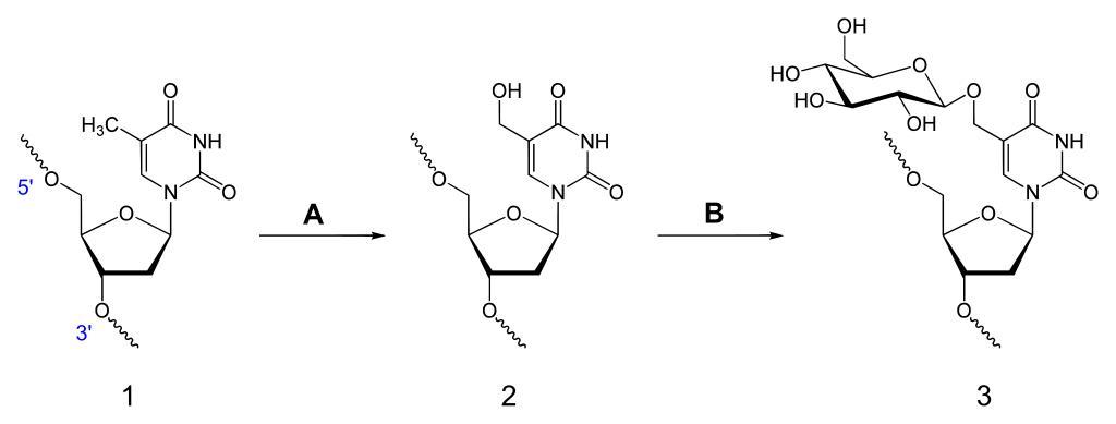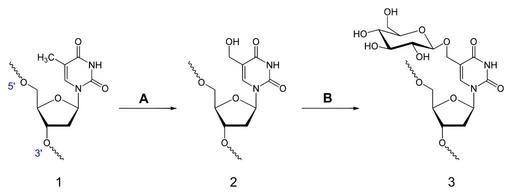 Keywords: Synthesis of D-glucopyranosyloxymethyluracil.svg D-glucopyranosyloxymethyluracil<br> A Thymidine hydroxylase; B beta-glucosyltranferase<br> 1 dT desoxy thymidine ; 2 HOCH3dU; 3 dJ D-glucopyranosyloxymethyluracil own ; PMID 18729733 Yikrazuul 2010-05-26 Glucosides Nucleotides |