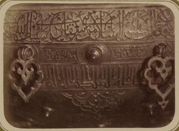 | Keywords: Syr-Darya Oblast. City of Turkestan. Beginning of the Inscription Bordering the Exterior of the Cauldron Located in the Tomb of Saint Sultan Akhmed Iassavi WDL3594.png Artwork ru Богаевский иколай Владими ович 1843 1912 гг fr Bogaevskii Nikolaï V 1843-1912 en Bogaevskii Nikolai V 1843-1912 zh 亚历山大·L· ,1840-1888 年 pt Bogaevskii Nikolai V 1843-1912 ar بوغافسكي، نيكولاي ف ، 1843-1912 es Bogaevskii Nikolai V 1843-1912 ru Сы да ьинская область Го од Ту кестан ачало надписи окаймляющей на ужную сто ону котла находящегося в г обнице святого султана Ахмеда Яссави fr Oblast de Syr-Darya Ville de Turkestan Début de l'inscription bordant l'extérieur du chaudron situé dans le sépulcre du vénérable sultan Akhmed Iassavi en Syr-Darya Oblast City of Turkestan Beginning of the Inscription Bordering the Exterior of the Cauldron Located in the Tomb of Saint Sultan Akhmed Iassavi zh 锡尔河 区 其斯 市 苏尔 ·艾哈迈德·亚萨维墓 内的大锅 外表环绕的铭文 头部分 pt Oblast de Sir Dária Cidade do Turquestão Início da inscrição que rodeia o exterior da pia ritual localizada no túmulo do santo sultão Ahmed Iassavi ar منطقة سير داريا مدينة تُرْكِستان بداية النقش الذي يُؤطِّر الجزء الخارجي للميضأة الموجودة في ضريح الولي سلطان أحمد يسوي ru Эта фотог афия элемента итуальной чаши для воды внут и мавзолея Ходжи Ахмеда Ясави в Яси сов еменный Ту кестан Казахстан соде жится в а хеологической части <em> Ту кестанского альбома </em> Шеститомное фотог афическое исследование было подготовлено и издано в 1871 1872 гг под пат онажем гене ала Константина П фон Кауфмана пе вого гене ал-губе нато а 1867 1882 гг Ту кестана как называли в то в емя те ито ию Цент альной Азии п инадлежавшую Российской импе ии Яси ассоции уется с суфийским мистиком Ходжой Ахмедом Ясави 1103 1066 гг великая слава кото ого побудила Тиму а Таме лана пост оить мемо иальную г обницу <em>ханаку</em> на месте его захо онения авзолею пост оенному в 1396 1398 гг п исущи ха акте ные че ты тиму идской а хитекту ы в то в емя пе еживавшей свой асцвет в Сама канде а снимке видна часть большой б онзовой итуальной чаши для воды; в надписи на чаше указано что она была поже твована Тиму ом Чаша ук ашена изысканными ботаническими фигу ами и пе сидско-а абскими надписями аве ху находится полоса с надписью выполненной письмом насх и пе еплетающейся с узо ом из завитков Под полосой видны деко ативные б онзовые элементы и еще одна надпись угловатыми буквами а езной пове хности в нижней части фотог афии видна а абеска Высота чаши составляет около одного мет а <br>Котлы; адписи; Ясави Ахмед уме в 1166 г ; Фотог афические исследования; П едметы елигиозного назначения; огильные памятники; Г обницы fr Cette photographie d'un détail du bassin dédié aux ablutions rituelles du mausolée de Khodzha Akhmed Iassavi à Yasi au Turkestan actuel Kazakhstan est extraite de l'ouvrage archéologique <em>Album du Turkestan</em> Cet inventaire photographique en six volumes fut réalisé entre 1871 et 1872 sous le patronage du général Konstantin P von Kaufman premier gouverneur général 1867-1882 du Turkestan nom donné aux territoires d'Asie centrale de l'Empire russe La ville de Yasi est associée au mystique soufi Khodzha Akhmed Iassavi 1103-1166 dont la renommée était telle que Tamerlan fit construire un sanctuaire commémoratif <em>khanaka</em> sur le site de sa tombe Bâti de 1396 à 1398 le mausolée présente les caractéristiques de l'architecture timuride en pleine apogée à Samarcande à cette époque Cette vue partielle du grand bassin dédié aux ablutions rituelles montre l'inscription indiquant qu'il fut donné par Tamerlan Le bassin est richement décoré de figures à fleurs et d'inscriptions perso-arabes Dans la partie supérieure de la photographie une bande d'inscription en écriture naskhi entrelacée de motifs de vrilles apparaît Des armatures décoratives en bronze et une autre inscription avec des lettres angulaires sont visibles sous cette bande Au bas de la photographie la surface bombée est ornée d'une arabesque Le bassin mesure environ un mètre de hauteur <br>Chaudrons; Inscriptions; I͡Asavi Akhmed mort en 1166; Inventaires photographiques; Articles religieux; Monuments funéraires; Tombes en This photograph of a detail of a ritual basin in the interior of the mausoleum of Khodzha Akhmed Iassavi in Yasi present-day Turkestan Kazakhstan is from the archeological part of <em>Turkestan Album</em> The six-volume photographic survey was produced in 1871-72 under the patronage of General Konstantin P von Kaufman the first governor-general 1867-82 o