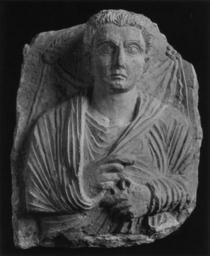 | Keywords: Syrian - Relief Portrait Bust - Walters 23231.jpg This male head and bust are carved in high relief on curved plaque century 1 2 white limestone with red and blue paint cm 47 35 accession number 23 231 2237 Edgar J Banks date and mode of acqusition unknown claimed Found in tomb Palmyra Henry Walters Baltimore 1929 mode of acquisition unknown Walters Art Museum Henry Walters Acquired by Henry Walters 1929 Inscription place of origin Cyclades Greece Walters Art Museum license Ancient Near East art in the Walters Art Museum Funerary reliefs from Palmyra in the United States Ancient Roman busts of men |