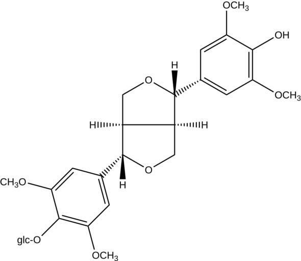 Keywords: (+)-syringaresinol.svg en -O-β-D-glucoside eletheroside E A constituent of Eleutherococcus senticosus Created using ChemDraw Ultra 12 2014-06-19 03 34 49 own Andromeas cc-zero Uploaded with UploadWizard Eleutherococcus senticosus Lignans