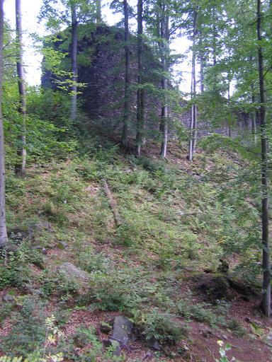 Keywords: Szczerba2.JPG en Ruins of the Szczerba Castle pl Ruiny zamku Szczerba - widok pochyłości pod zamkiem own Ktw 2009-08-16 Szczerba Castle