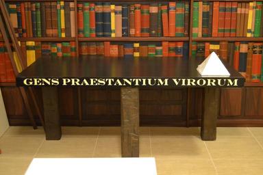 Keywords: table wood pyramid library book should latin praestantium gens virorum