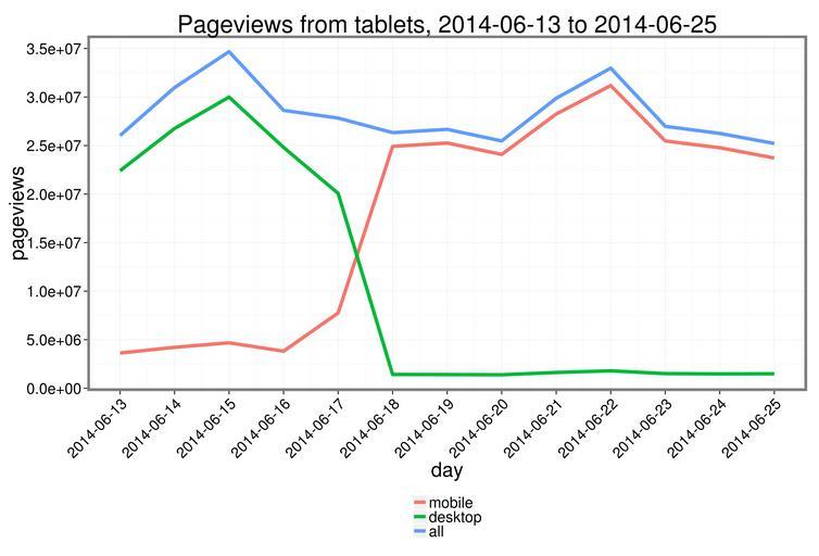 Keywords: Tablet desktop to mobile switchover.png en Requests from tablets divided by whether they hit the mobile or desktop sites pre- and post- tablet-to-mobile-site switchover 2014-06-27 17 53 20 own Ironholds cc-zero Uploaded with UploadWizard Wiki Research Presentation slides from the WMF Metrics and Activities Meetings |