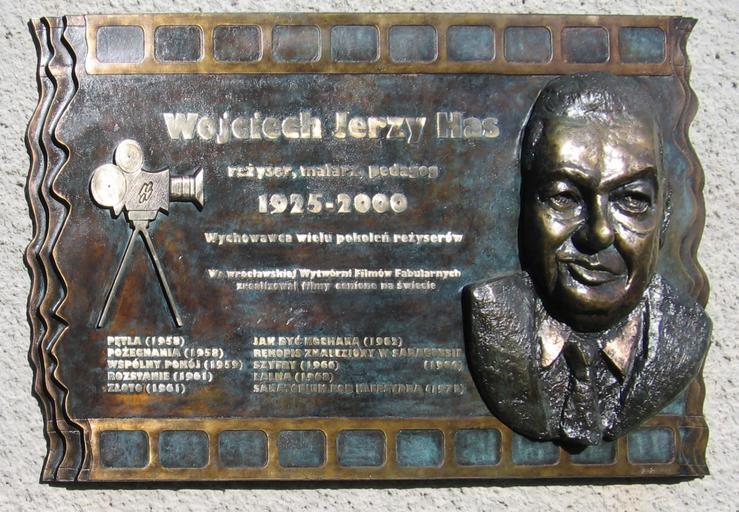 Keywords: Tablica WojciechHas.jpg Wrocław Poland - inscription in memory of film director Wojciech Jerzy Has on the wall of Feature Films Production building 2005-10-29 own assumed Julo Film directors Wojciech Jerzy Has Plaques in Wrocław