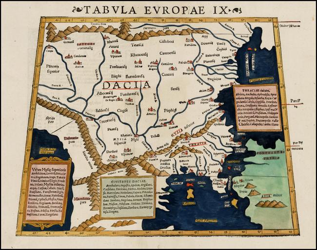 Keywords: Tabula Europae IX.jpg en The Ninth European Map depicting the eastern Balkans from one of the editions of Sebastian Münster's Cosmographia an expansion of Ptolemy's Geography The map is unchanged from the 1540 plates Tabula Europae Nona ~ 1550 https //www raremaps com/gallery/detail/30310/Tabula_Europae_IX_Greece_and_Turkey/Munster html BL Ruderman Antique Maps Ptolemy other versions <gallery> Sebastian Munster - Tabula europae IX Dacia jpg </gallery> PD-old-70-1923 Cosmographia Münster Ptolemy's 9th European Map 1550 Maps in Latin 1550s maps 1540 maps Maps with cartouches |