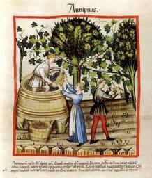 Keywords: Tacuin Automne03.jpg Weinlese im Herbstbild Autumpnus des Tacuinum Sanitatis fol 54 verso Codex Vindobonensis Series nova 2644 Österreichische Nationalbibliothek Nach Ibn Botlans Text ist der Herbst gemäßigt kalt im zweiten Grad Zu bevorzugen sei seine Mitte und am besten wandelt er sich stufenweise etwa zu kalt und feucht Er schadet Menschen mit gemäßigter Kompexion und schwächlichen Naturen Dagegen helfen Bäder Der Herbst fördert darüber hinaus die Schwermut Er nützt Personen mit warmer und feuchter Komplexion Jugendlichen und Kindern in warmen und feuchten Gegenden Nach anderer Ansicht in gemäßigten Breiten en Autumn Autumpnus Nature Moderately cold in the second degree Optimum Its central period Usefulness when one proceeds gradually toward opposites ar for example toward warmth and dampness Dangers It is harmful to moderate temperatures and to those predisposed toward consumption Neutralization of the Dangers By the application of moist elements and with baths Effects Increases melancholy humors It is suitable to warm and damp temperaments to the young and adolescent in warm and damp regions or in temperate areas fr Automne Autumpnus Nature Assez froid dans au second degré Optimum Sa période centrale Usage lorsque l'on évolue graduellement vers les contraires par exemple vers la chaleur et l'humidité Dangers Il est dangereux aux températures modérées et pour ceux qui prédisposés à la consomption Neutralisation des dangers par l'application d ™Ã©léments humides et par des bains Effets Accroît l ™humeur mélancolique Il est adapté aux tempéraments chauds et humides aux jeunes et aux adolescents au temps des régions chaudes et humides ou dans les zones tempérées Tacuinum sanitatis in medicina Codex Vindobonensis Series nova 2644 der Österreichischen Nationalbibliothek Graz Akademische und Druck- und Verlagsanstalt 2004 ISBN 3-201-01831-7 Scan von Schutzumschlag Kommentar von Franz Unterkircher S 92 author ~ 1390 PD-old-100 Vintage in art Autumn in art People with grapes in art Wine presses in art 14th-century fashion Tacuinum sanitatis Cod Vindob ser nov 2644 History of wine Grape treading |