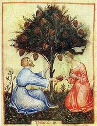 Keywords: Tacuin pin27.jpg en Pine Cones Pinee Nature Warm in the second degree dry in the first Usefulness They stimulate the bladder the kidneys and the libido Dangers Worms hatch in their bark Neutralization of the Dangers Trim the tree often From the Tacuinum of Paris fr Pommes de pin Pinee Nature Chaud au deuxième degré sec au premier degré Usage Elles stimulent la vessie les reins et la libido Dangers Des vers peuvent éclore dans l ™Ã©corce Neutralisation des dangers Trim souvent l'arbre book scan unknown master century 14 PD-Art Tacuinum sanitatis - BNF NAL1673 Pines in art |
