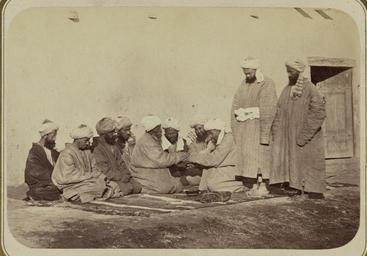 | Keywords: Tadzhik Craft Customs. Ritual of Placing Bread in the Hands of a Guild Initiate WDL11003.png Artwork ru Кун Александ Людвигович 1840 1888 гг fr Kun Aleksandr L 1840-1888 en Kun Aleksandr L 1840-1888 zh 亚历山大·L· ,1840-1888 年 pt Kun Aleksandr L 1840-1888 ar كُن، ألكسندر ل ، 1840-1888 es Kun Aleksandr L 1840-1888 ru Таджикские емесленные об яды Класть хлеб за пазуху посвящающему fr Traditions artisanales tadjikes Rituel consistant à placer du pain dans les mains d'un initié de guilde en Tadzhik Craft Customs Ritual of Placing Bread in the Hands of a Guild Initiate zh 塔吉克的手工艺习俗 将 包放到公会新成员手中的入会仪式 pt Costumes dos tadjiques Ritual de colocar o pão nas mãos de um iniciante na guilda ar عادات الحرفيين الطاجيك طقوس وضع الخبز في يديّ عضو مبتدئ في النقابة ru Эта фотог афия входит в этног афическую часть <em> Ту кестанского альбома </em><em></em> всесто оннего исследования Цент альной Азии п едп инятого после того как в 1860-х годах в егионе установилось господство Российской импе ии Альбом созданный по аспо яжению гене ала Константина Пет овича фон Кауфмана 1818 1882 годы пе вого гене ал-губе нато а оссийского Ту кестана состоит из четы ех частей в шести томах «Часть а хеологическая» два тома «Часть этног афическая» два тома «Часть п омысловая» один том и «Часть исто ическая» один том Основным составителем альбома был оссийский востоковед Александ Людвигович Кун аботавший совместно с иколаем Венедиктовичем Богаевским В альбоме п едставлено около 1200 фотог афий а также а хитекту ные планы аква ельные исунки и ка ты «Часть этног афическая» включает в себя 491отдельную фотог афию на 163 листах а фотог афиях изоб ажены п едставители азличных на одов егиона листы 1 33 повседневная жизнь и итуалы листы 34 91 а также виды де евень и го одов уличные то говцы и комме ческая деятельность листы 92 163 <br>Хлеб; Этног афические фотог афии; Ремесленные цехи; Фотог афические исследования; Об яды и це емонии; Таджики fr Cette photographie est extraite de la partie ethnographique de l'<em>Album du Turkestan</em> étude visuelle complète de l'Asie centrale entreprise après que l'Empire russe prit le contrôle de la région dans les années 1860 Commandé par le général Konstantin Petrovich von Kaufman 1818 1882 premier gouverneur général du Turkestan russe l'album est composé de six volumes en quatre parties la partie archéologique deux volumes la partie ethnologique deux volumes la partie sur les métiers un volume et la partie historique un volume L'album fut essentiellement compilé par l'orientaliste russe Aleksandr L Kun assisté de Nikolai V Bogaevskii Il comporte près de 1200 photographies et inclut également des plans architecturaux des dessins à l'aquarelle et des cartes La partie ethnographique compte 491 photographies sur 163 planches montrant des individus des différentes peuplades de la région planches 1 à 33 des scènes de la vie quotidienne et des rites planches 34 à 91 ainsi que des vues de villages et de villes de vendeurs ambulants et d'activités commerciales planches 92 à 163 <br>Pain; Photographies ethnographiques; Guildes; Inventaires photographiques; Rites et cérémonies; Tadjiks en This photograph is from the ethnographical part of <em>Turkestan Album</em><em> </em>a comprehensive visual survey of Central Asia undertaken after imperial Russia assumed control of the region in the 1860s Commissioned by General Konstantin Petrovich von Kaufman 1818 82 the first governor-general of Russian Turkestan the album is in four parts spanning six volumes Archaeological Part two volumes ; Ethnographic Part two volumes ; Trades Part one volume ; and Historical Part one volume The principal compiler was Russian Orientalist Aleksandr L Kun who was assisted by Nikolai V Bogaevskii The album contains some 1 200 photographs along with architectural plans watercolor drawings and maps The Ethnographic Part includes 491 individual photographs on 163 plates The photographs show individuals representing the different peoples of the region Plates 1 33 ; daily life and rituals Plates 34 91 ; and views of villages and cities street vendors and commercial activities Plates 92 163 <br>Bread; Ethnographic photographs; Guilds; Photographic surveys; Rites and ceremonies; Tajiks zh 这张照片出自<em> 其斯 相册 </em>的民族部分,该相册是俄罗斯 国 19 世纪 60 年代取得中亚控制 后, 手制 的 部针对该 区的综合 图像调查记录 相册由俄罗斯驻 其斯 (俄罗斯 国中亚属 的名称)首任 康斯 丁·彼得罗维奇·凡· 夫曼(Konstantin Petrovich von Kaufman,1818 82 年)将军赞助完成,共分六卷,四个部分: 古部分 (两卷); 民族部分 (两卷); 贸易部分 ( 卷)和 历史部分 ( 卷) 相册的主要编纂人是俄罗斯 方学 亚历山大·L· Aleksandr L Kun 亚历山大是 尼可莱·V·柏盖维斯基 Nikolai V Bogaevskii 的