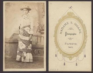 Keywords: Tahitian woman standing, photograph by Madame S. Hoare, Papeete, Tahiti, ca. 1870.jpg en Albumen print of a Tahitian woman by Madame S Hoare Papeete Tahiti ca 1870 Card with ornate reverse imprint in gilt purple and black ink reading Madame S Hoare / Photographer / Papeete Tahiti Sitter wears an interesting combination of western and native costume including a native cloth wrapped around her skirt and bare feet -- something most unusual in 19th-century studio portraits ca 1870 http //cwfp biz/cgi-bin/sg_past/tm pl itm ic567a 8_Hoare~MadameS 1870 Madame S Hoare <gallery>File Tahitian woman photograph by Madame S Hoare Papeete Tahiti ca 1870 jpg</gallery> Women of Tahiti Historical images of Papeete Photographs by Sophia Hoare PD-old |