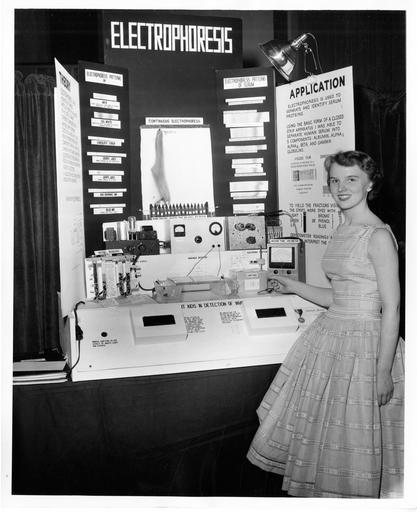 Keywords: smithsonian institution smithsonianinstitution woman standing young teenager 1956 display dress 1950s electrophoresis smile allentown smithsonian institution archives smithsonianinstitutionarchives women's history month womenshistorymonth women in science womeninscience 2010 electricity 20th century - mid 20thcenturymid academia blackandwhite monochrome black and white Creator: Science Service Subject: Anderson, Taimi Toffer 1937- Type: Black-and-white photographs Date: 1956 Topic: Science fairs      Women scientists Local number: SIA Acc. 90-105 [SIA2010-0105] Summary: In 1956, Taimi Toffer Anderson (1937- ), a senior at Allentown High School, Allentown, Pennsylvania, won the girls' physical sciences division at the National Science Fair. Her project focused on how electricity can be used to trace protein molecules. Her sister, Kristina Toffer, won in the same division the following year. Taimi, born in Estonia, immigrated to the United States in 1952, and later became a landscape gardener Cite as: Acc. 90-105 - Science Service, Records, 1920s-1970s, Smithsonian Institution Archives Persistent URL:http://siris-archives.si.edu/ipac20/ipac.jsp?&profile=all&source=~!siarchives&uri=full=3100001~!287592~!0#focus Repository:Smithsonian Institution Archives View more collections from the Smithsonian Institution. Creator: Science Service Subject: Anderson, Taimi Toffer 1937- Type: Black-and-white photographs Date: 1956 Topic: Science fairs Women scientists Local number: SIA Acc. 90-105 [SIA2010-0105] Summary: In 1956, Taimi Toffer Anderson (1937- ), a senior at Allentown High School, Allentown, Pennsylvania, won the girls' physical sciences division at the National Science Fair. Her project focused on how electricity can be used to trace protein molecules. Her sister, Kristina Toffer, won in the same division the following year. Taimi, born in Estonia, immigrated to the United States in 1952, and later became a landscape gardener Cite as: Acc. 90-105 - Science Service, Records, 1920s-1970s, Smithsonian Institution Archives Persistent URL:http://siris-archives.si.edu/ipac20/ipac.jsp?&profile=all&source=~!siarchives&uri=full=3100001~!287592~!0#focus Repository:Smithsonian Institution Archives View more collections from the Smithsonian Institution. |