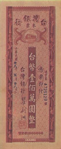 Keywords: Taiwan-1M-Yuan.jpg Bearer's check of 1 000 000 Old Taiwan dollars issued by Bank of Taiwan In the earlier years of KMT rule Taiwan suffered from severe inflation due to the corruption of Nationalist ROC government The currency deflated so fast that the ruling government had to issue currency with denominations on the order of 1 million dollars Authorities would later issue the New Taiwan Dollar to replace the deflated Taiwan Dollar in an exchange rate of one to four million These notes must be distinguished from the one's the Japanese Taiwan Ginkō issued under the same English name 1899-1945 Billete de un millón de yuanes de 1949 La incapacidad para atajar la hiperinflación fue una de las causas del desprestigio del gobierno de la República de China http //www sinobanknote com/twd/banknote/TaiwanP1961-1M-Yuan- 1948 _a jpg 2004 11 23 Original upload log www sinobanknote com Mababa original uploader www sinobanknote com Banknotes of the Republic of China 1912-1949 Banknotes of Taiwan Bank of Taiwan dollar Banknotes with a face value of 1000000 |