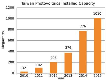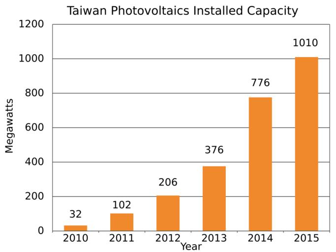 Keywords: Taiwan Photovoltaics Installed Capacity.svg translate yes en Installed photovoltaics in Taiwan from 2010 to 2015 Source http //www iea-pvps org/fileadmin/dam/public/report/PICS/IEA-PVPS_-__A_Snapshot_of_Global_PV_-_1992-2015_-_Final_2_02 pdf IEA-PVPS 2016-05-03 own Delphi234 other versions cc-zero Solar energy in Taiwan Photovoltaic power statistics |