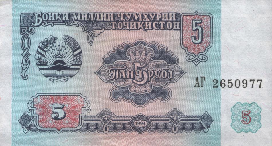 | Keywords: Tajikistan-1994-Bill-5-Obverse.jpg 5 таджикских ублей 1994 Офо мление - как у аве са 1 убля СССР 1961 г Цвет - как у пяти ублей СССР 1991 г 5 roubles of Tajikistan 1994 own scan 1994 ациональный банк Таджикистана National Bank of Tajikistan Бонки миллии Тоҷикистон PD-TJ-exempt banknotes Banknotes of Tajikistan 1994 Banknotes with a face value of 5 Blue banknotes |
