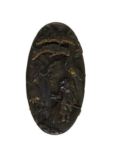 | Keywords: Takase Eiju - Kashira with Yamabushi Monk and a Waterfall - Walters 511129.jpg A yamabushi monk is depicted looking at a waterfall He wears the distinctive yamabushi clothing including a small hat and a sash with pom-poms around his neck He carries a wicker pack and a walking stick Yamabushi lived in the mountain where they practiced a religious tradition that mixed elements of Shintoism and Buddhism This is part of a set with Walters 51 1128 ca 1775 1800 Edo silver gold cm 3 3 accession number 51 1129 15157 William T / Henry Walters Collection Baltimore date and mode of acquisition unknown Walters Art Museum Henry Walters Acquired by William T or Henry Walters none place of origin Edo present-day Tokyo Japan Walters Art Museum license Tosogu Japanese sword fittings in the Walters Art Museum Takase Eiju Media contributed by the Walters Art Museum needs category review |