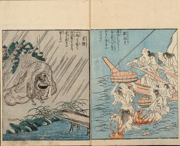| Keywords: Takehara Shunsensai, Tokaen Michimaro, Picture Book of a Hundred Tales (Ehon hyaku monogatari), vol. 2, 1841.jpg A raccoon-dog with tanuki with his giant scrotum and the boat ghosts fune yūrei from Picture Book of a Hundred Tales Ehon hyaku monogatari vol 1 written by Tōkaen Michimaro 桃花 三千麿 fl 1808 1841 and illustrated by Takehara Shunsensai 1841 Honolulu Museum of Art accession TD 2013-02-073b Honolulu Museum of Art 1841 Takehara Shunsensai 竹原春泉斎 active c early 19th century PD-old-100 Ehon in the Honolulu Museum of Art Shunsensai Ehon Hyaku Monogatari Funayurei Tanuki |