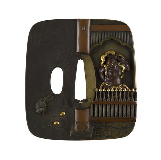 Keywords: Tamagawa Masaharu - Tsuba with a Temple Guardian Statue - Walters 51222.jpg The fierce figure on the right of this tsuba is one of the paired guardians ni-ô who guard the main south gate at Buddhist temples in Japan The fierce figures protect temples from evil spirits The dove on the left side of the composition is a symbol of the Shinto deity Hachiman the deified form of the Emperor Ôjin died 310 The gate guardian shown here may be from the Tsurugaoka Hachiman shrine and temple complex in Kamakura Both guardians were transferred to another site in the late 19th century when Buddhist objects were removed from Shinto shrines On the reverse of the tsuba is a crescent moon 1st half Other date century 18 Edo iron sentoku gold silver copper cm 8 9 8 08 0 49 accession number 51 222 27079 Henry Walters Baltimore date and mode of acquisition unknown Walters Art Museum Henry Walters Acquired by Henry Walters Signature Genshosai/Masaharu place of origin Edo present-day Tokyo Japan Walters Art Museum license Tsuba in the Walters Art Museum Media contributed by the Walters Art Museum needs category review Tamagawa Masaharu |