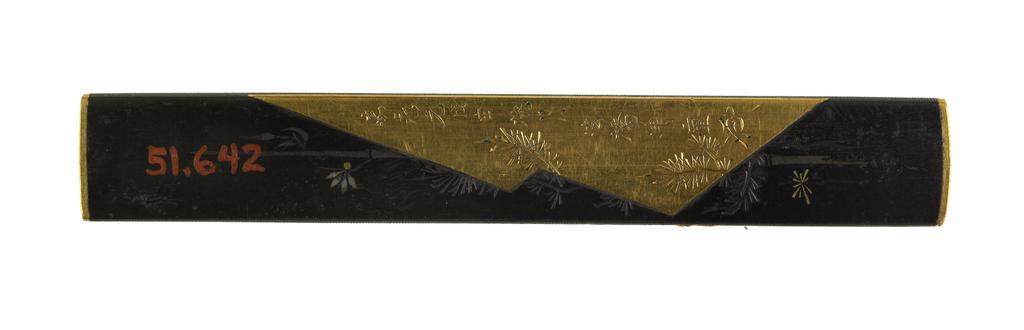 | Keywords: Tanaka Kiyoshige - Kozuka with a Monkey with a Battledore - Walters 51642 - Back.jpg At the bottom of the kozuka a monkey stands looking upwards The monkey holds a battledore which is used during New Year's celebrations to play a traditional game A gourd is strapped to the monkey's back The reverse is decorated with a gold pattern that resembles a special paper used for poems called tanzaku The motif on the reverse is shochiku which is used to indicate the New Year It consists of black inlayed bamboo incised pine boughs and two small plum blossoms The upper flower is inlayed in mother of pearl and gold The lower flower is in gold 1848 shakudo gold copper cm 9 6 accession number 51 642 16984 Henry Walters Baltimore date and mode of acquisition unknown Walters Art Museum Henry Walters Acquired by Henry Walters Date Kaei gen tsuchinoe saru tôgetsu; Signature Hokkyô Kiyoshige kao ; Translation 1848 year of the monkey third month Hokkyô Kiyoshige place of origin Edo present-day Tokyo Shiba Japan Walters Art Museum license Kozuka in the Walters Art Museum Media contributed by the Walters Art Museum needs category review Tanaka Kiyoshige |
