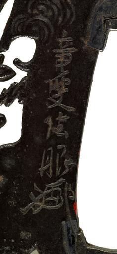 Keywords: Tanaka Kiyotoshi - Tsuba with an "Oni" (Demon) - Walters 5190 - Mark B.jpg A demon called an oni in Japanese is depicted crouched down looking at mushrooms Kiyotoshi cleverly crafted the demon's body using the holes for the sword and short knife found in any tsuba The demon wears the typical costume of a tiger skin loincloth and carries a Chinese-style fan Gold highlights the demon's eyes wrist ankle and loincloth The reverse shows the demon in left profile under a full moon While demons were originally symbols of evil they are often depicted in humorous situations between 1804 1876 Edo iron with copper alloy gold silver cm 7 1 accession number 51 90 26675 Henry Walters Baltimore date and mode of acquisition unknown Walters Art Museum Henry Walters Acquired by Henry Walters Signature Ikkashi Signature Ryûsô Hôgen place of origin Edo present-day Tokyo Japan Walters Art Museum license Tsuba in the Walters Art Museum Tanaka Kiyotoshi Media contributed by the Walters Art Museum needs category review Loincloths in art |