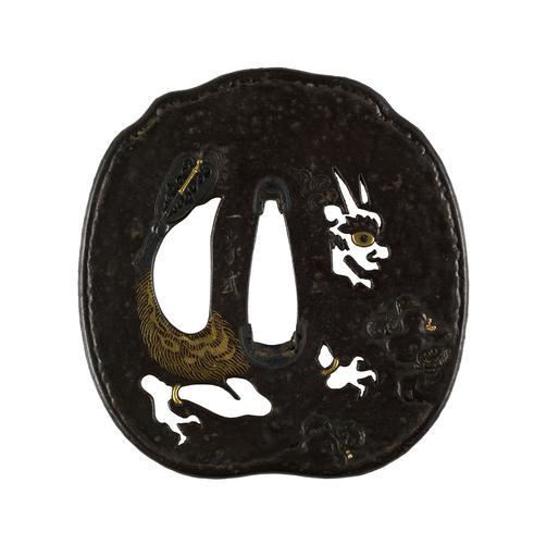 Keywords: Tanaka Kiyotoshi - Tsuba with an "Oni" (Demon) - Walters 5190.jpg A demon called an oni in Japanese is depicted crouched down looking at mushrooms Kiyotoshi cleverly crafted the demon's body using the holes for the sword and short knife found in any tsuba The demon wears the typical costume of a tiger skin loincloth and carries a Chinese-style fan Gold highlights the demon's eyes wrist ankle and loincloth The reverse shows the demon in left profile under a full moon While demons were originally symbols of evil they are often depicted in humorous situations between 1804 1876 Edo iron with copper alloy gold silver cm 7 1 accession number 51 90 26675 Henry Walters Baltimore date and mode of acquisition unknown Walters Art Museum Henry Walters Acquired by Henry Walters Signature Ikkashi Signature Ryûsô Hôgen place of origin Edo present-day Tokyo Japan Walters Art Museum license Tsuba in the Walters Art Museum Tanaka Kiyotoshi Media contributed by the Walters Art Museum needs category review Loincloths in art |