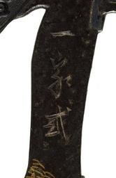 Keywords: Tanaka Kiyotoshi - Tsuba with an "Oni" (Demon) - Walters 5190 - Mark A.jpg A demon called an oni in Japanese is depicted crouched down looking at mushrooms Kiyotoshi cleverly crafted the demon's body using the holes for the sword and short knife found in any tsuba The demon wears the typical costume of a tiger skin loincloth and carries a Chinese-style fan Gold highlights the demon's eyes wrist ankle and loincloth The reverse shows the demon in left profile under a full moon While demons were originally symbols of evil they are often depicted in humorous situations between 1804 1876 Edo iron with copper alloy gold silver cm 7 1 accession number 51 90 26675 Henry Walters Baltimore date and mode of acquisition unknown Walters Art Museum Henry Walters Acquired by Henry Walters Signature Ikkashi Signature Ryûsô Hôgen place of origin Edo present-day Tokyo Japan Walters Art Museum license Tsuba in the Walters Art Museum Tanaka Kiyotoshi Media contributed by the Walters Art Museum needs category review Loincloths in art |