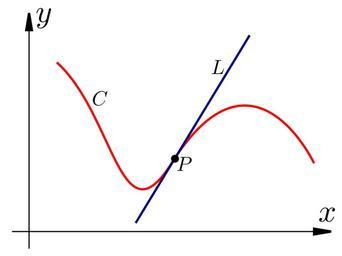 Keywords: Tangency Example 2.svg A diagram showing a curve C red a line L blue and the point of intersection point P black The line intersects the curve but 'is a tangent to it Self-made Inkscape 2007-10-23 Inductiveload differential calculus Tangency |