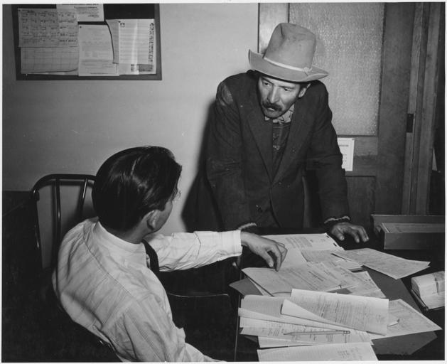 | Keywords: Taos County, New Mexico. Farm Security assistant supervisor and client, FSA office, Taos. - NARA - 521971.jpg Scope and content Full caption reads as follows Taos County New Mexico Farm Security assistant supervisor and client FSA office Taos General notes 521971 Local identifier 83-G-41750 Department of Agriculture Bureau of Agricultural Economics Division of Economic Information ca 1922 - ca 1953 NARA-Author Rusinow Irving Photographer 5307166 <br /> Still Picture Records Section Special Media Archives Services Division NWCS-S National Archives at College Park 8601 Adelphi Road College Park MD 20740-6001 12/1941 Record group Record Group 83 Records of the Bureau of Agricultural Economics 1876 - 1959 Record group ARC 412 Photographic Prints Documenting Programs and Activities of the Bureau of Agricultural Economics and Predecessor Agencies compiled ca 1922 - ca 1947 documenting the period ca 1911 - ca 1947 Series ARC 521048 File unit File unit ARC Variant control numbers NAIL Control Number NWDNS-83-G-41750 Other versions <gallery> File Taos_County _New_Mexico _Farm_Security_assistant_supervisor_and_client _FSA_office _Taos _-_NARA_-_521971 tif tif File Taos_County _New_Mexico _Farm_Security_assistant_supervisor_and_client _FSA_office _Taos _-_NARA_-_521971 jpg jpg </gallery> NARA-cooperation PD-USGov Irving Rusinow 1941 in Taos County |