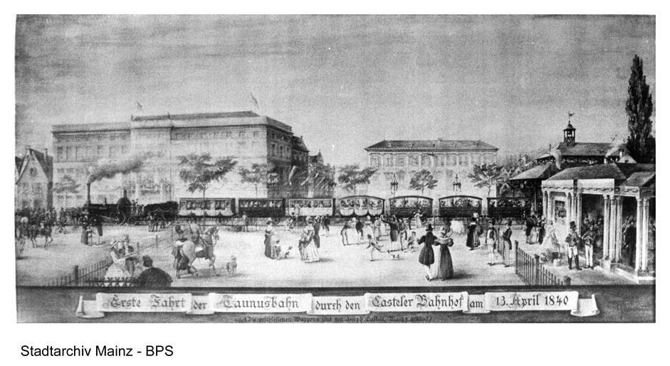 Keywords: Taunus-Eisenbahn - Kastel.tif en First ride of a train through railway station of Castel today Mainz-Kastel; Suburb of Wiesbaden Right side station building The Train is running in the direction of Wiesbaden Closed coaches were built by Joseph Gastell Mainz de Erste Fahrt der Taunusbahn durch den Kasteler Casteler Bahnhof am 13 April 1840 Die geschlossenen Wagen sind von Joseph Gastell Mainz gebaut Ansicht vom Rhein aus auf den Bahnhof rechts und Gebäude der Eisenbahnstraße Zug in Richtung Wiesbaden Stadtarchiv Mainz Signature BPSF / 1208 A Author ~ 1840 PD-old Taunus-Eisenbahn Bahnhof Mainz-Kastel |
