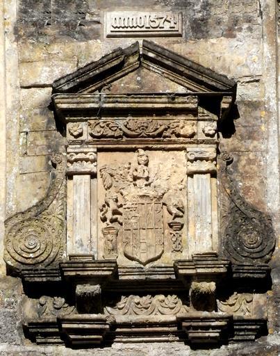 Keywords: TawstockCourtGatehouseAedicule.JPG heraldic achievement of William Bourchier 3rd Earl of Bath d 1623 The ten quarterings shown on the escutcheon are as follows with tinctures added <ref>The same quarterings are shown on the monument of Lady Frances Bourchier d 1612 in the Bedford Chapel Chenies Buckinghamshire daughter of the 3rd Earl of Bath http //www middlesex-heraldry org uk/publications/monographs/chenies/cheniesBKM-monuments htm</ref> 1 Argent a cross engrailed gules between four water bougets sable Bourchier 2 Gules a fess argent between 15 billets or 5 4 3 2 1 Louvaine across the first two quarters is a label of three points for difference 3 Quarterly per fess indented argent and gules FitzWarin 4 Gules a fret or Audley 5 Argent three aspen leaves erect gules Cogan 6 Sable a chevron barry nebuly argent and gules Hankford 7 Argent two bars wavy sable Stapledon 8 Argent two bars gules each charged with three bezants Martin 9 Gules four fusils in fess ermine Dinham 10 Gules three pairs of arches argent Arches The dexter supporter of a horse or possibly heraldic antelope stands on a pedestal showing a peacock in its pride the crest of George Manners 11th Baron de Ros c 1470-1513 <ref>Debrett's Peerage 1968 p 968</ref> whose daughter Eleanor Manners married after 1524 as his 2nd wife John Bourchier 2nd Earl of Bath 1499-1560/61 The sinister supporter of a dove or falcon stands on a pedestal showing the Bourchier knot <ref>The Manners peacock and Bourchier knot are also shown sculpted with the arms of Bourchier impaling Manners above the south-east door to Tawstock Church</ref> Above the shield is the Bourchier crest A man's head in profile proper ducally crowned or with a pointed cap gules<ref>Visitation of Devon 1895 p 106</ref> References <references/> own photo Lobsterthermidor <span class signature-talk >talk</span> 22 59 19 March 2013 UTC 2013 Tawstock Court Hankford arms Stapledon arms FitzWarin arms Bourchier arms Dinham arms Arches arms Cogan arms Bourchier knot Earls of Bath |