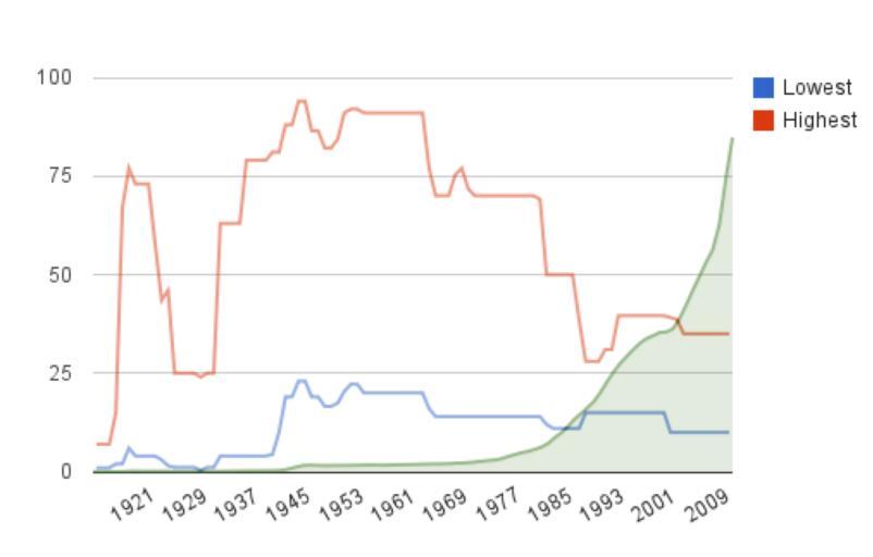 | Keywords: Taxes debt.png en Tax rates for the highest red and lowest blue income brackets since 1913 with the United States public debt in nominal terms i e not adjusted for inflation green in the background Congressional Budget Office and Bureau of the Public Debt for tax and public debt data respectively Quophnix Cc-zero Check categories 2011 March 26 en wikipedia Taxation_in_the_United_States 2 Personal income taxes in the United States | ||||